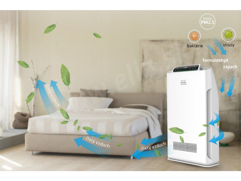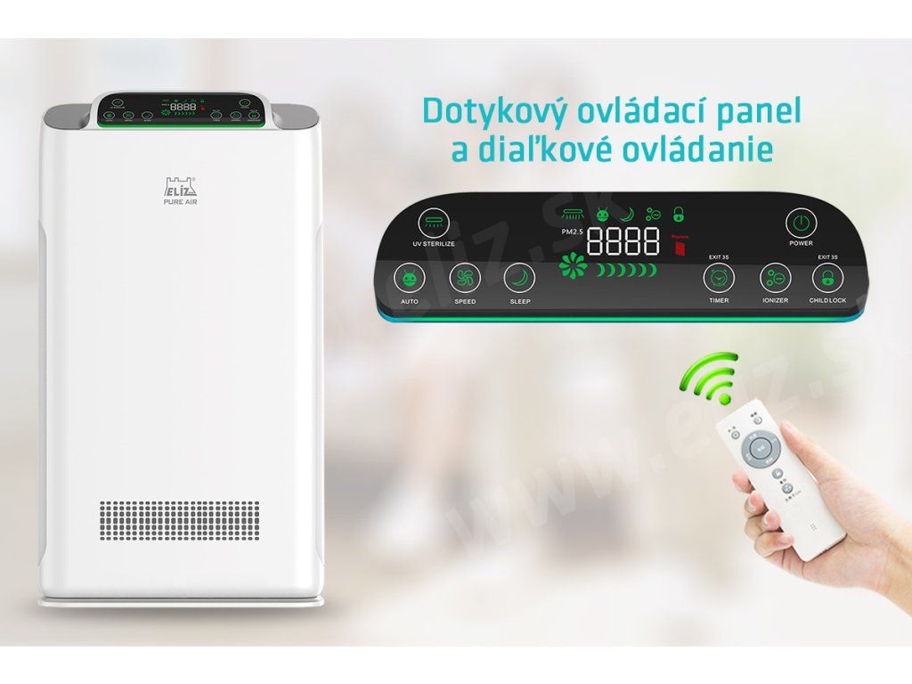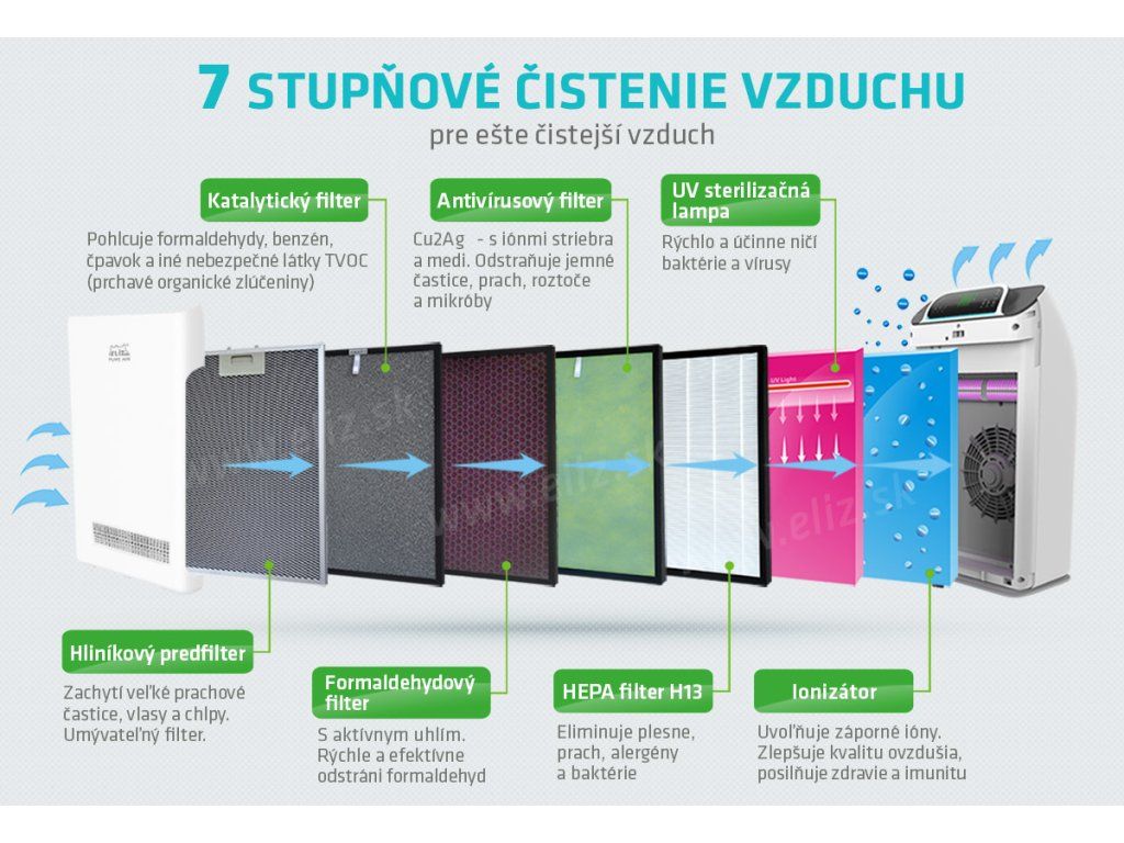 Inteligentná čistička vzduchu ELÍZ EAP 320 UV WIFI vám poskytne čistý a svieži vzduch zbavený prachu, pachov, alergénov, roztočov, mikróbov a iných nebezpečných látok. Predstavuje efektívnu kombináciu čističky, ionizátora a UV lampy a jej hlavnou prednosťou je 7 stupňové čistenie vzduchu a 5 druhov vymeniteľných filtrov, vďaka čomu odstráni zo vzduchu až 99,9% lietajúcich častíc PM2.5 (častice menšie ako 2,5 μm). Použitím najnovšej technológie antivírusového a antibakteriálneho filtra Cu2Ag s iónmi striebra a medi sa v spolupráci s kvalitným HEPA filtrom triedy H13 dosiahne vynikajúci čiastiaci účinok na zachytenie a odstránenie baktérií a vírusov zo vzduchu v miestnosti. HEPA filter H13 dosahuje účinnosť filtrácie viac ako 99,97% pri časticiach väčších ako 3 μm. Čističku EAP 320 UV WIFI a jej vysokú účinnosť čistenia tak ocení každý, kto chce dýchať zdravý vzduch, najmä alergici. Skvelo sa tak hodí pre použitie v domácnosti, kancelárii či ordinácii až do veľkosti 50 m2. Výhodou je tiež možnosť ovládať čističku cez WiFi pomocou aplikácie v telefóne či tablete. Inteligentná prevádzka a senzor kvality ovzdušia Plne automatický režim sám upravuje prevádzku čističky a rýchlosť ventilátora v závislosti na aktuálnom znečistení okolitého prostredia, ktoré sníma inteligentný senzor kvality vzduchu. Displej zobrazí hodnotu prachových častíc PM2.5 v reálnom čase so svetelnou indikáciou kvality ovzdušia AQI (Air Quality Index).Zelená farba (hodnota PM2.5 <60) - dobrá kvalitaOranžová farba (hodnota PM2.5 je 60-150) - zhoršená kvalita, stredné znečistenieČervená farba (hodnota PM2.5 ≥150) - zlá kvalita. Hodnoty PM2.5 indikujú vysoké znečistenie. Vyberte si spôsob ovládania čističky Čističku je možné pohodlne ovládať až tromi spôsobmi - tlačidlami na dotykovom ovládacom paneli, diaľkovým ovládaním, alebo ovládať ju na diaľku cez WiFi pomocou aplikácie v telefóne alebo tablete. Mobilná aplikácia umožňuje plnohodnotné ovládanie odkiaľkoľvek s dostupnosťou internetu. Aplikácia Tuya Smart je dostupná pre Android a iOS. Pri každom type ovládania je možné zapnúť Detskú poistku - blokovanie tlačidiel ovládania. 7 stupňové čistenie vzduchu Hliníkový predfilter - zachytí veľké prachové častice, vlasy, srsť, pele, atď. Filter je umývateľnýKatalytický filter - pohlcuje a rozkladá formaldehydy, benzén, čpavok a iné nebezpečné látky TVOC (prchavé organické zlúčeniny)Formaldehydový filter - s aktívnym uhlím. Rýchlo a efektívne odstráni aj tie najjemnejšie častice toxických látok ako je formaldehydAntivírusový filter Cu2Ag - s iónmi striebra a medi. Odstraňuje jemné častice, prach, roztoče a mikróby (baktérie a vírusy)HEPA filter H13 - zachytáva plesne, alergény, roztoče, baktérie, vírusy a malé prachové časticeUV lampa - rýchlo a účine ničí baktérie a vírusyIonizátor - generátor záporných iónov - zlepšuje kvalitu vzduchu, posilňuje zdravie a imunitu Sleep - Nočný režimAktiváciou nočného režimu sa vypne displej a svetelná indikácia znečistenia pod displejom. Motor po krátkej chvíli začne pracovať len na nízkych otáčkach s úrovňou hluku do 29 dB, aby vás čistička v noci nerušila a dopriali ste si pokojný spánok. Hlavné výhody čističky vzduchu: 3 v 1 - Čistička, Ionizátor, UV sterilizačná lampa CADR (rýchlosť filtrácie vzduchu): 320 m3/hod 7 stupňové čistenie vzduchu Odstráni až 99,97% lietajúcich častíc väčších ako 0,3 μm 5 druhov vymeniteľných filtrov - hliníkovy prachový predfilter, katalytický filter, formaldehydový filter, antivírusový filter a HEPA filter Antivírusový filter Cu2Ag s iónmi striebra a medi + HEPA filter triedy H13 Automatický režim čistenia vzduchu Indikátor znečistenia vzduchu časticami PM 2.5 v reálnom čase Svetelná indikácia kvality ovzdušia AQI Nastavenie rýchlosti ventilátora (rýchlosti čistenia) v 3 úrovniach Ionizátor - uvoľňovanie záporných iónov, 20 miliónov/cm3 UV germicídna lampa - ultrafialové žiarenie s vlnovou dĺžkou 365 nm Sleep - nočný režim (vypnutie displeja a nízka hlučnosť ≤29,4 dB) Automatické pripomenutie a indikácia výmeny filtrov Časovač - nastavenie časovača vypnutia až do 12 hodín (v krokoch po 30 min.) Dotykový ovládací panel a diaľkové ovládanie WIFI ovládanie - aplikácia v telefóne /tablete (dostupné pre Android a iOS) Detská poistka - blokovanie ovládania Bezpečnostná poistka v prípade prevrátenia Jednoduchá výmena filtrov Dĺžka napájacieho kábla: 1,9 m Návod - EAP 320 UV WIFI (SK) Príslušenstvo:Filter EF300Filter EF301Filter EF302Dodatočné parametre