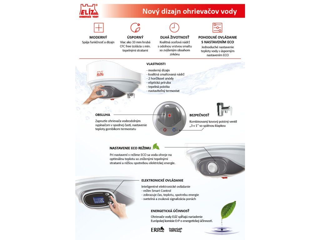 Elektrický tlakový ohrievač vody ELÍZ EURO 120 XR s objemom 120 litrov je vhodný pre jedno alebo viac odberných miest. Určený je pre vodorovnú nástennú montáž. Vývody vody sú z pravej strany. Nádrž ohrievača vody je vyrobená z kvalitnej ocele chránená vrstvou zirkónového smaltu. Kvalitná polyuretánová izolácia bez CFC hrúbky 33 mm zaručuje nízke tepelné straty a úsporu nákladov na ohrev vody. Pomocou termostatu umiestnenom na ovládacom paneli viete nastaviť teplotu vody v rozsahu 7 - 75°C, s možnosťou nastavenia režimu ECO. Pri nastevní v režime ECO sa voda ohreje na optimálnu teplotu 55°C, so zníženými tepelnými stratami a nižšou spotrebou elektrickej energie. Minimálna hodnota termostatu slúži ako ochrana proti zamrznutiu vody v ohrievači. Ohrievač má zabudované dve anódové tyče, ktoré garantujú efektívnu ochranu nádrže proti korózii a výrazne predlžujú jej životnosť. Vypínač so svetelnou kontrolkou ohrevu slúži k zapnutiu / vypnutiu ohrievača v prípade našej neprítomnosti, čo umožňuje úsporu energie. Upozornenie: od 4/2025 na ležatých ohrievačov už nie je indikátor teploty! Hlavné výhody a vlastnosti: Rýchly ohrev vody Horizontálna montáž Energetická trieda C Kvalitná oceľová nádrž so zirkónovým smaltom Bezfreónová polyuretánová izolácia s vysokou hustotou, hrúbka 33 mm Nízke tepelné straty a nízke prevádzkové náklady vďaka hrubej izolácii Bezpečnosť - unikátna 6-stupňová ochrana Dvojitá anódová ochrana nádrže - 2 horčíkové anódy Termostat umiestnený na ovládacom paneli - rozsah 7 - 75 °C Nastavenie režimu ECO Tepelná poistka proti prehriatiu Vodeodolný vypínač s kontrolkou prebiehajúceho ohrevu Závesná konzola a kovový poistný ventil so spätnou klapkou súčasťou ohrievača Predĺžená záruka 5 rokov na nádrž ohrievača Návod - EURO 50-200 X_XR (SK)Dodatočné parametre