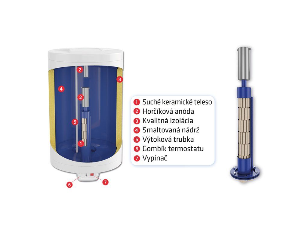 Elektrický tlakový ohrievač vody EURO 151 Z (zúžený model) so suchým keramickým ohrievacím telesom je ideálnym riešením pre oblasti s tvrdou vodou. Suché keramické ohrievacie teleso nie je ponorené vo vode, ale uložené v kovovom púzdre príruby, preto nedochádza k rýchlemu zanášaniu telesa vodným kameňom. Je vhodný pre jedno alebo viac odberných miest a určený pre zvislú nástennú montáž. Nádrž ohrievača vody je vyrobená z kvalitnej ocele chránená vrstvou zirkónového smaltu. Kvalitná polyuretánová izolácia bez CFC hrúbky 32 mm zaručuje nízke tepelné straty a úsporu nákladov na ohrev vody. Pomocou termostatu umiestnenom na ovládacom paneli viete nastaviť teplotu vody v rozsahu 7 - 75°C, s možnosťou nastavenia režimu ECO. Pri nastevní v režime ECO sa voda ohreje na optimálnu teplotu 55°C, so zníženými tepelnými stratami a nižšou spotrebou elektrickej energie. Minimálna hodnota termostatu slúži ako ochrana proti zamrznutiu vody v ohrievači. Ohrievač má zabudované dve anódové tyče, ktoré garantujú efektívnu ochranu nádrže proti korózii a výrazne predlžujú jej životnosť. Vypínač so svetelnou kontrolkou ohrevu slúži k zapnutiu / vypnutiu ohrievača v prípade našej neprítomnosti, čo umožňuje úsporu energie. Hlavné výhody a vlastnosti: Ideálne riešenie pre oblasti s tvrdou vodou Suché keramické ohrievacie teleso Rýchly ohrev vody Energetická trieda C Jednoduchý servis bez vypúšťania vody Kvalitná oceľová nádrž s vrstvou zirkónového smaltu Bezfreónová polyuretánová izolácia s vysokou hustotou, hrúbka 32 mm Nízke tepelné straty a nízke prevádzkové náklady vďaka hrubej izolácii Bezpečnosť - unikátna 6-stupňová ochrana Dvojitá anódovú ochrana - 2 horčíkové anódy Termostat umiestnený na ovládacom paneli s rozsahom 7-75 °C Nastavenie režimu ECO Tepelná poistka proti prehriatiu Indikátor teploty Vodeodolný vypínač so svetelnou kontrolkou ohrevu Protimrazová ochrana Závesná konzola a kovový poistný ventil so spätnou klapkou súčasťou ohrievača Predĺžená záruka 5 rokov na nádrž ohrievačaDodatočné parametre