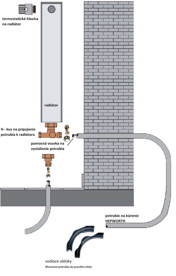 Nižšie sú zobrazené komponenty, ktoré budete potrebovať na pripojenie radiátorov ku svojpomocnému systému kúrenia HEPWORTH. |