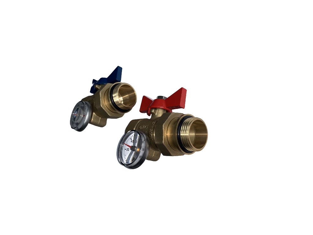 W - KIT Guľ. ventily mosadz. PRIAME k rozdeľ., šrób. 1" + teplomer 0°C-120°C (1 bal.=1 mod.+1 čer.)